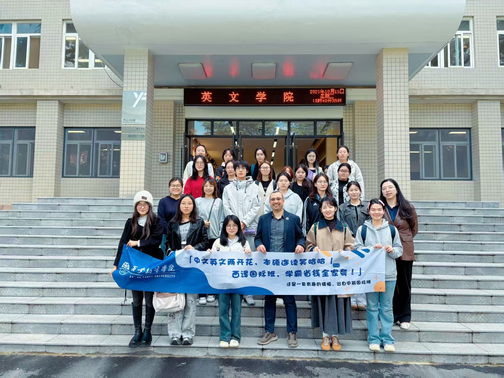 10 月 15 日,西安翻译学院 24-25 级国际班在西区 4109T 教室开展《国际视野下的创新与学术交流》线下课。特邀西交利物浦大学 Khalid Akhal 教授等专家团队主讲。课上,Akhal 教授解析西浦国际化教育模式、创业转化机制及热门专业,设 “Water Bottle Challenge” 互动;专家团还解答了跨专业申请、文书撰写等问题,廖雅婷老师详解西浦硕士申请流程与奖学金政策。同学们升级国际教育认知,链接优质资源,提升跨文化沟通与创新能力。未来,西译国际班还将推出更多此类活动。