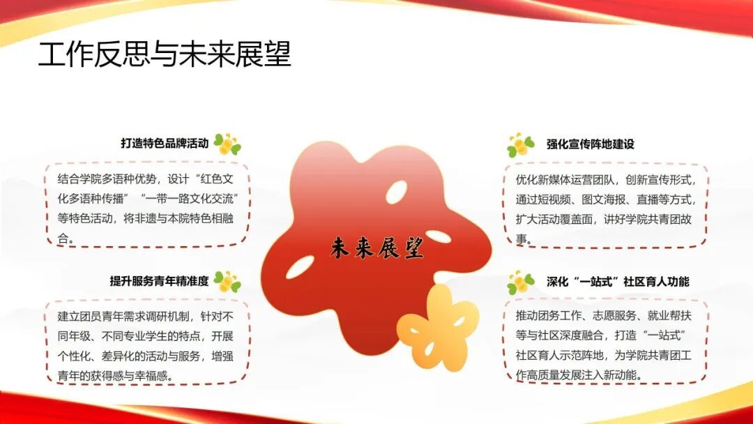 新程再启,奋楫扬帆。逐光2026年新途,国际语言文化学院团总支将立足多语种专业优势持续深耕,以思想引领与跨文化实践深度融合为核心,创新多语种育人载体;聚焦团学骨干语言能力与综合素养双向提升,健全分层培养机制;提升“一站式”学生社区服务效能,优化精准服务供给;打造具有国际文化辨识度的品牌活动,增强组织凝聚力。同时深化基层团支部建设,激活支部内生动力,锻造坚强有力的团组织,引领广大青年在语言传播中讲好中国故事,在跨文化交流中挺膺担当,在强国建设征程中践行青春使命。