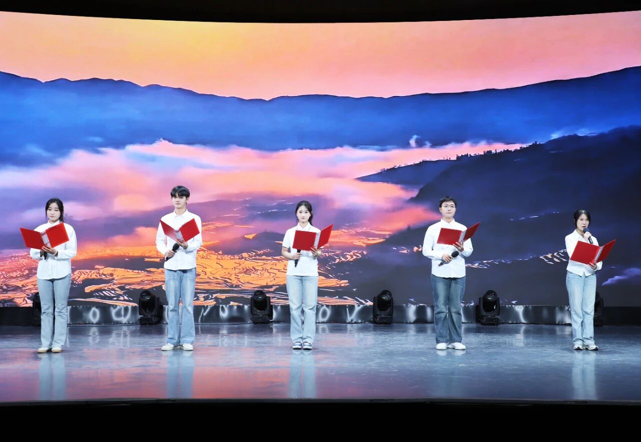 开场朗诵《百年交响》,百年在声线中苏醒,化作同一段乐章,话筒承接历史,续写新时代的诗行,用普通话韵律,让交响在山河回响。