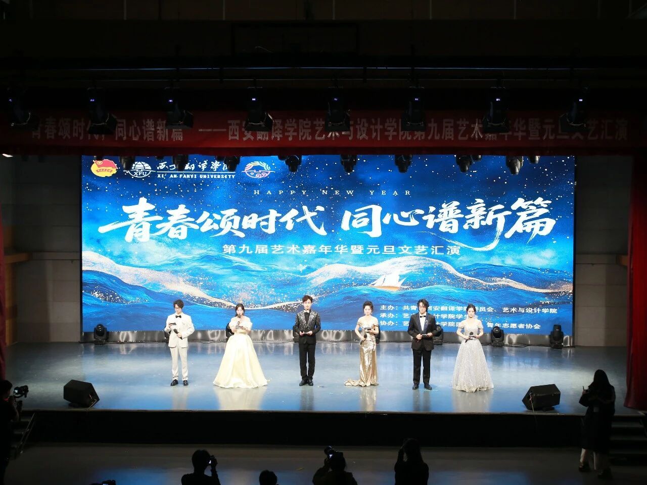 当鎏金的舞台灯光刺划破冬日的夜幕,悠扬的旋律在礼堂上空回荡。12月18日,由共青团西安翻译学院委员会、艺术与设计学院主办,艺术与设计学院学生会承办,艺术与设计学院团总支、青年志愿者协会协办的“青春颂时代 同心谱新篇”第九届艺术嘉年华暨元旦文艺汇演于一号综合楼演播大厅盛大启幕。艺术与设计学院领导、老师和学生代表共同观看晚会。