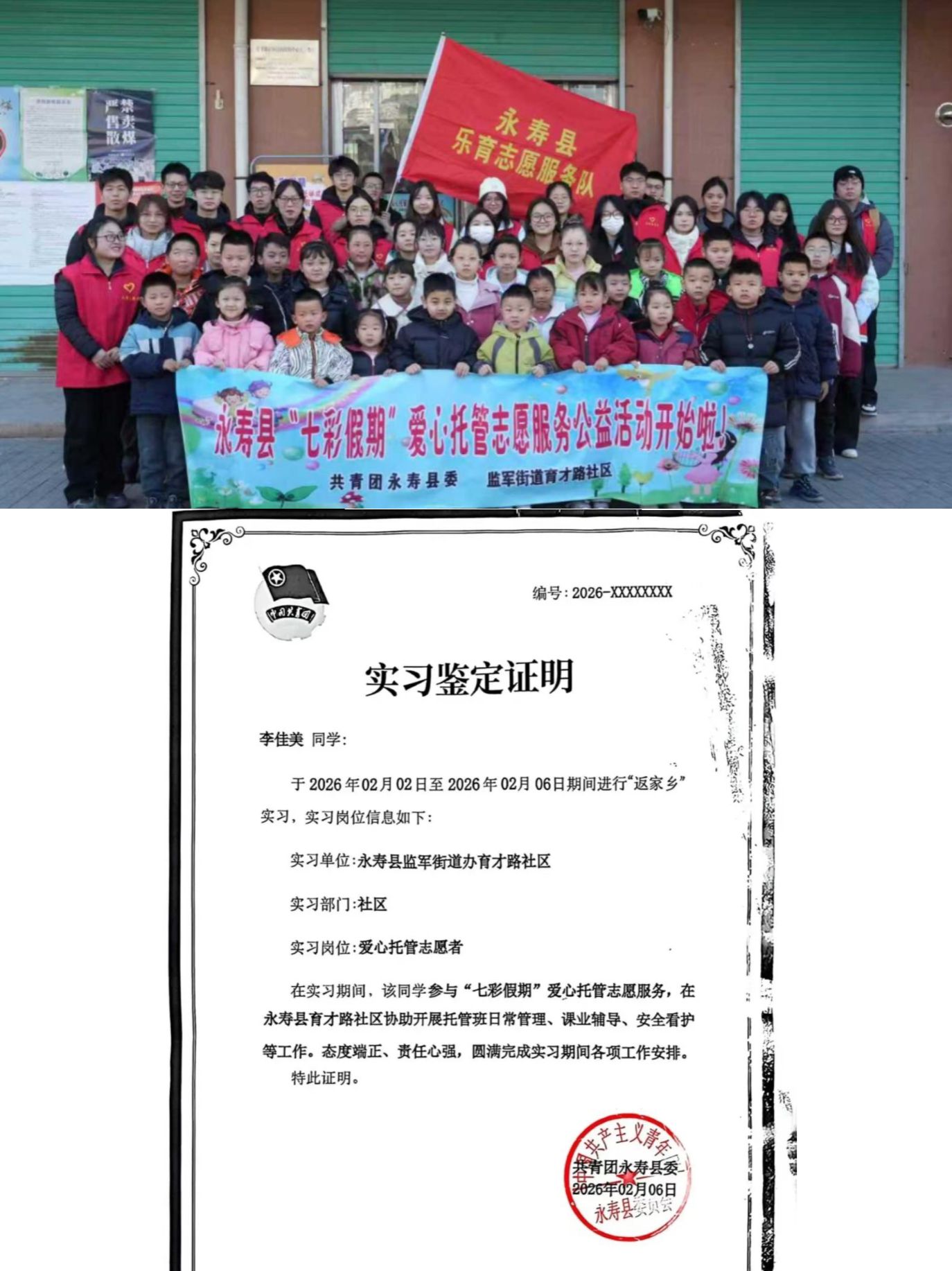 实践心得:2月2日至8日,我在永寿县监军街道办育才路社区 “七彩假期” 爱心托管班开展返家乡志愿服务,为留守儿童和新就业群体子女提供学业辅导、安全看护等服务,短短一周的实践,让我收获颇丰、感悟良多。