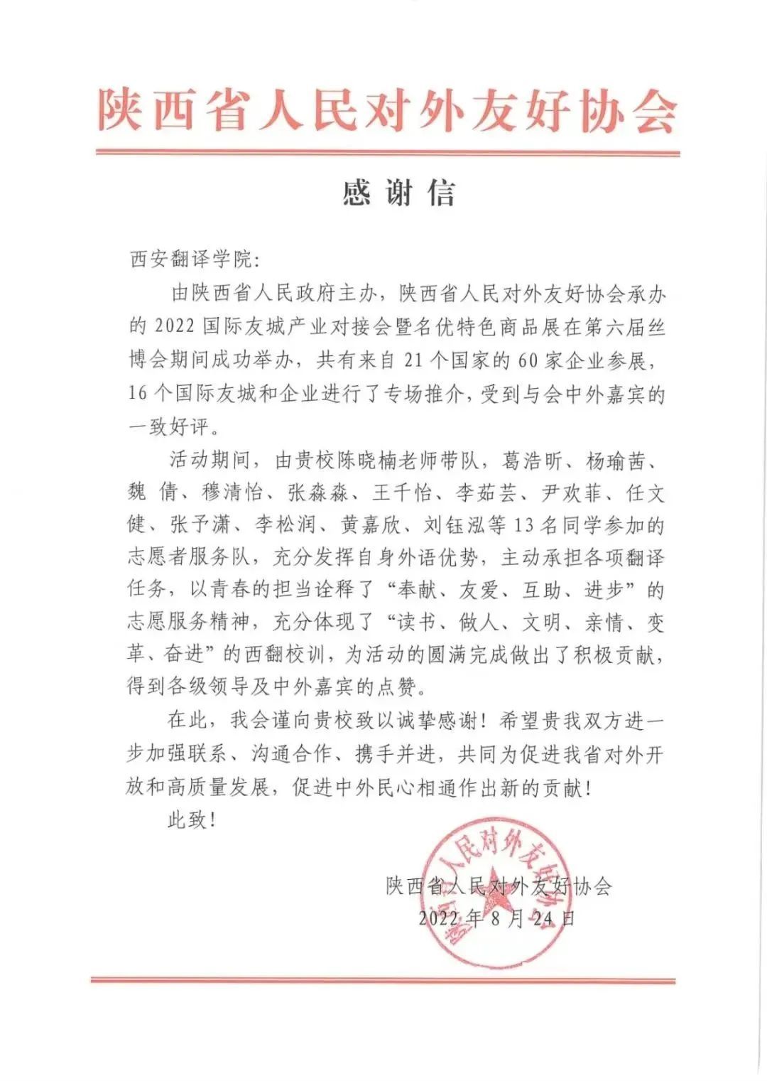西安翻译学院高级翻译学院于2019年创建“志青春 愿未来”志愿服务队,志是士之心,以天下为己任,愿是原心,是初心。“志青春 愿未来”代表着志愿服务依靠青年学生力量,将青春之志向与未来之愿景相结合、相统一。为了更好的增强实践育人实效、服务区域经济文化发展、做好中国文化的学习和传播者,特成立“讲好中国故事 增强文化自信”对外交流志愿服务项目。本项目秉承“立足专业、走进翻译、深入实践、服务社会”的宗旨,通过创新实施“345”工作模式,即突出“三力”、聚焦“四抓”、增强“五效”,学思践悟 知行合一,开展思政教育与外语专业相结的志愿服务活动。在校领导、院领导的部署指导下,积极为区域经济文化发展提供优质语言服务,组织千余名学生参加20多次涉外志愿服活动,其中6次国家级、17次省市级。高质量的服务效果,受到中国非洲研究院、陕西省外事办、陕西省人民对外友好协会等举办方及服务对象的广泛高度好评。