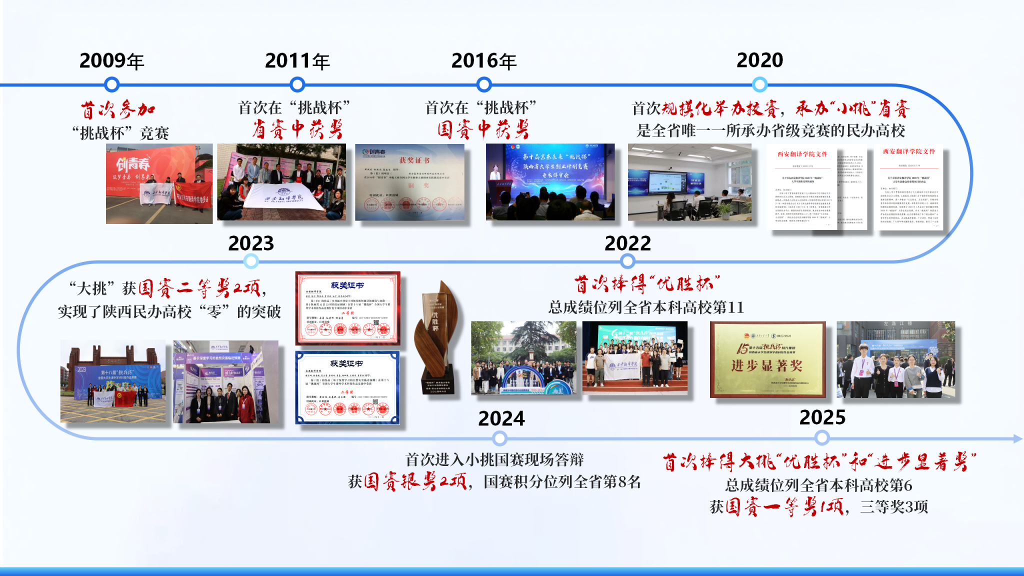 回溯荣誉之路,西译的科创成绩连续7年保持“阶梯式攀升”的强劲势头:2022年“小挑”以全省本科高校第11的总成绩,首次捧得“优胜杯”,2023年“大挑”获国赛二等奖2项,均实现了陕西民办高校的新突破,2024年“小挑”获国赛银奖2项,2025年“大挑”以全省第六的成绩捧得省赛“优胜杯”和“进步显著奖”,并于2023年(作为陕西唯一高校)、2024年(作为陕西唯一民办高校)连续两年在“挑战杯”工作中受到团中央的表扬。