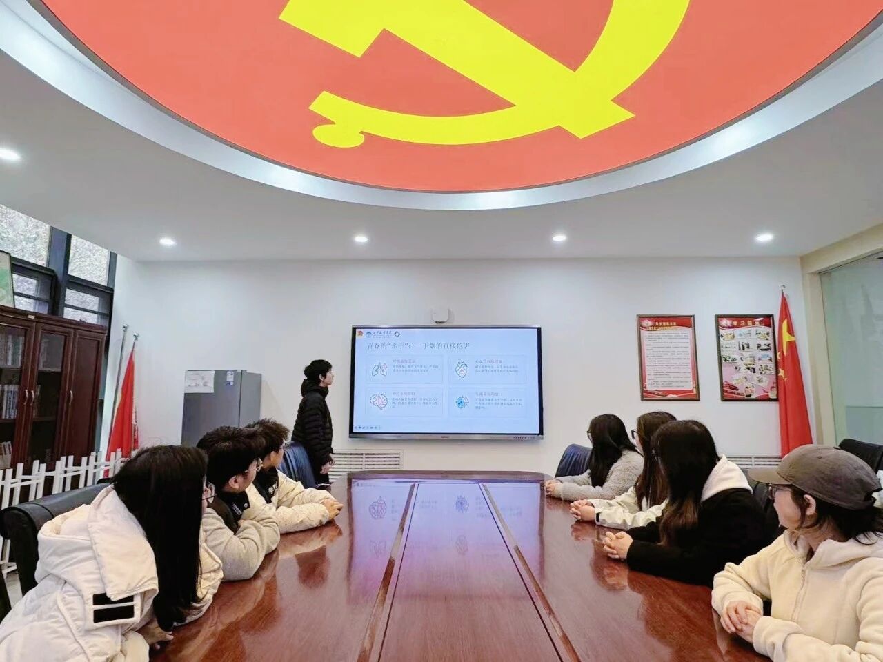 聚焦宿舍生活场景,工作人员在“一站式”学生社区活动室举办了“无烟宿舍·健康同行”主题分享会,将禁烟知识、健康理念与文明宿舍建设紧密结合,进一步引导广大同学将健康意识转化为自觉行动,积极倡导共建洁净、安全、文明的住宿环境。让文明健康的生活习惯在校园宿舍蔚然成风,打造平安和谐、清新向上的校园生活。